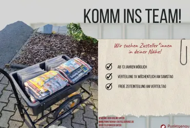 Wir suchen ab sofort zuverlässige Zustellerinnen und Zusteller – ob jung oder alt –, die Freude daran haben, an der frischen Luft zu arbeiten und sich etwas dazuzuverdienen.
